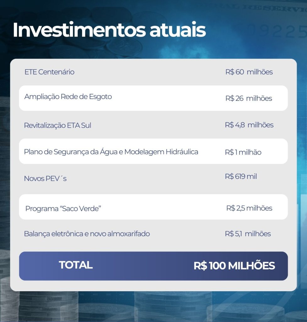 No esgotamento sanitário, o planejamento contempla novas frentes de expansão urbana e avanços no saneamento rural. Somadas, essas iniciativas representam um volume estimado de R$ 49,5 milhões em investimentos futuros, reforçando o compromisso do Samae com a modernização contínua dos serviços, a proteção ambiental e a melhoria da qualidade de vida da população, avançando de forma consistente rumo à meta de 100% de esgoto tratado, conforme estabelecido no Plano de Governo.