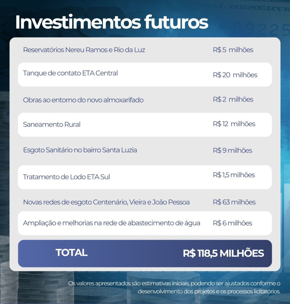 Estão previstas melhorias logísticas e operacionais, como as obras do entorno do novo almoxarifado central, a ampliação da capacidade de reservação com novos reservatórios nos bairros Nereu Ramos e Rio da Luz e investimentos na modernização das estações de tratamento de água e ampliação de redes.