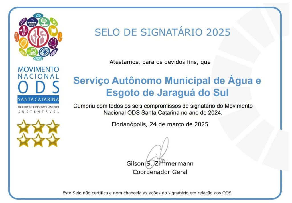 Outro destaque foi a homenagem prestada pela Câmara de Vereadores Mirim ao Programa de Educação e Valorização da Água (Proeva), que completou 20 anos de atuação e já impactou mais de 32 mil Amigos da Água. A autarquia também conquistou novamente o Selo de Signatário do Movimento Nacional ODS Santa Catarina, alcançando a pontuação máxima de seis estrelas, em reconhecimento às ações alinhadas ao ODS 6 – Água Potável e Saneamento Básico.